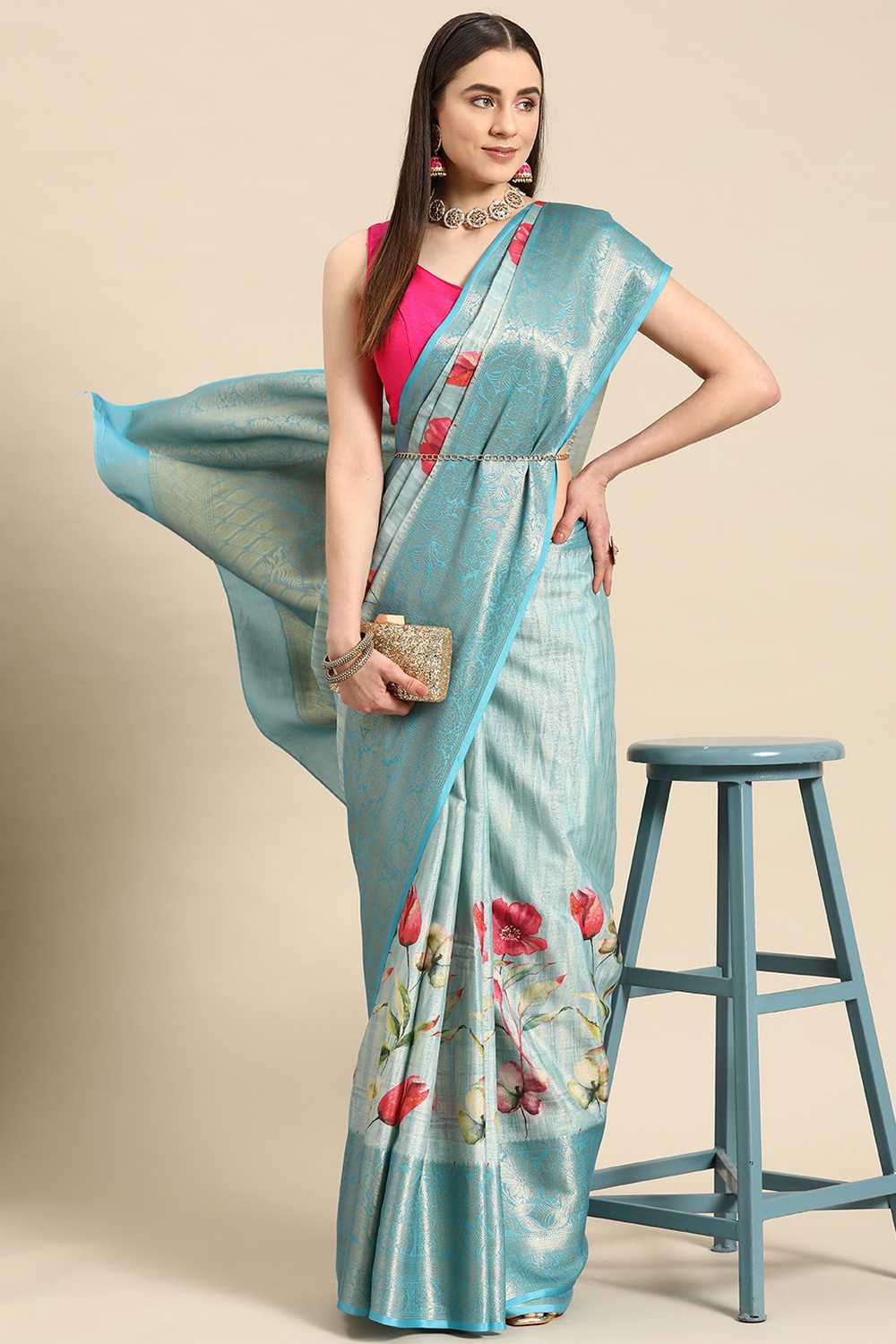 Anise Blue Tissue Floral Digital Printed Ready to Wear One Minute Saree