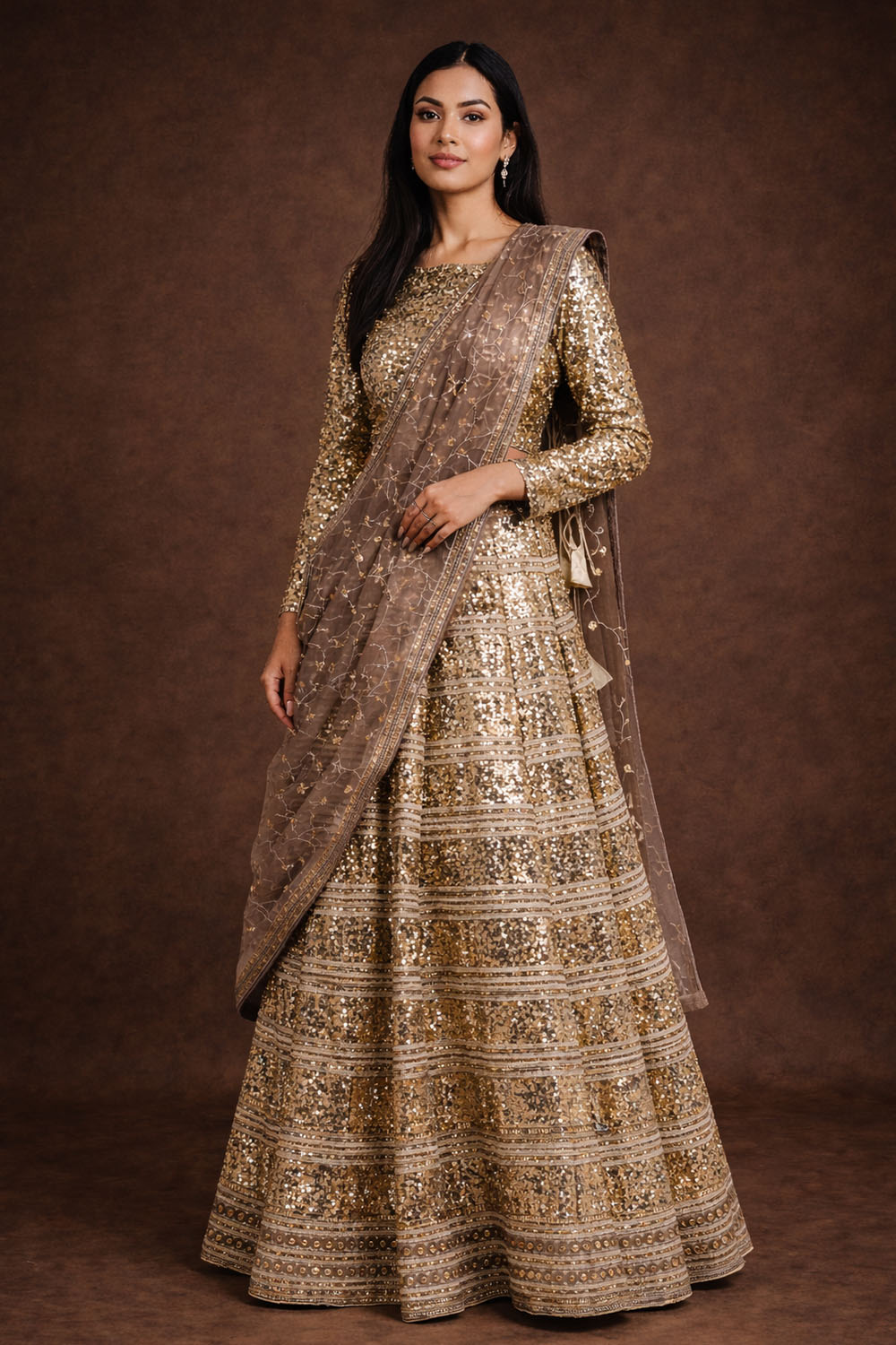 The richly detailed skirt pairs beautifully with a coordinated full-sleeve blouse and matching drape, creating a regal and structured look. Perfect for weddings, festive celebrations, and cultural events.