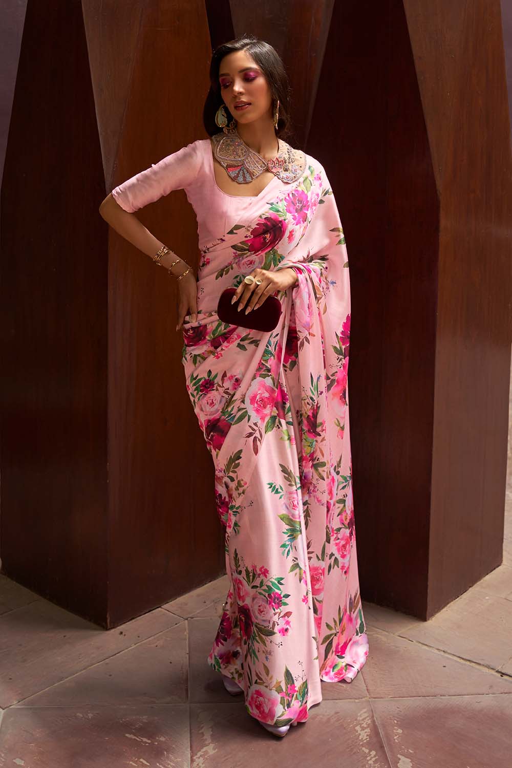 Nadia Light Pink Floral Printed Satin One Minute Saree