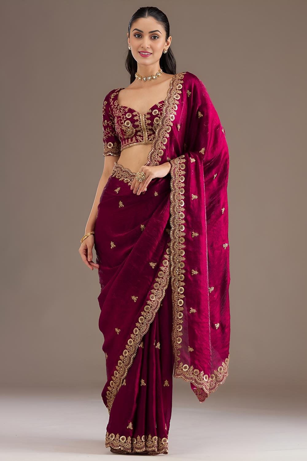 Gold jewelry enhances traditional red sarees, while diamond or kundan pieces add elegance. For a modern party look, opt for minimal crystal or statement earrings.