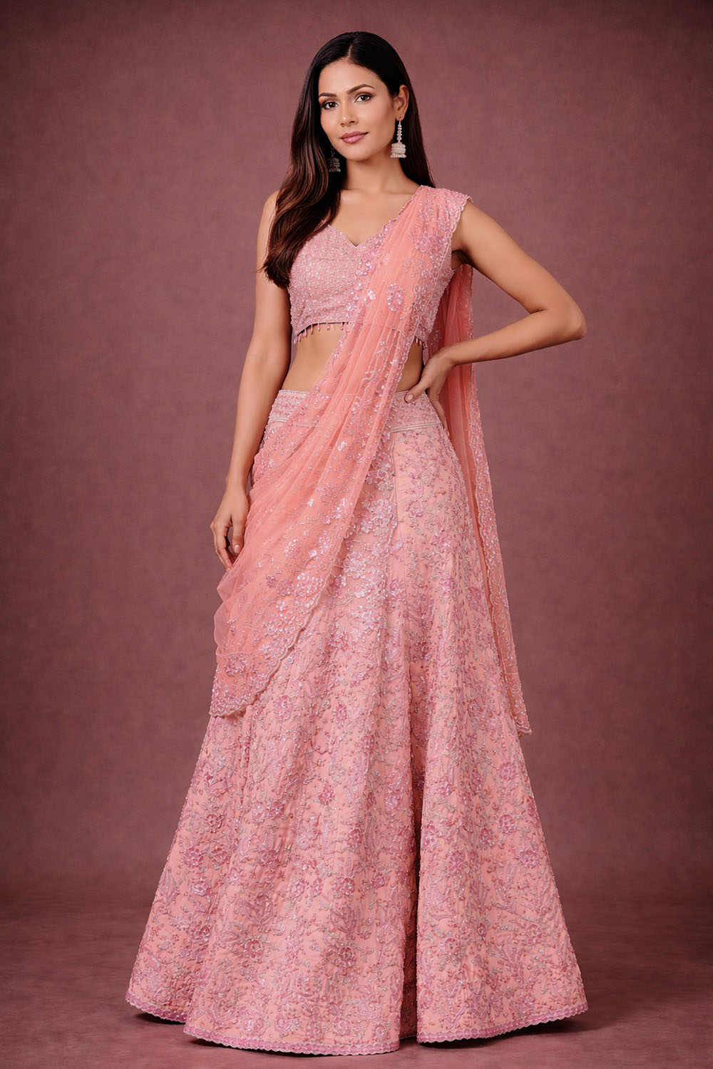 Graceful and feminine, this peach Lehenga Saree features delicate embroidery and a lightweight drape for a soft, elegant finish. The lehenga-style skirt adds volume while maintaining comfort and ease of movement. Paired with a sleeveless blouse and matching drape, this ensemble is ideal for daytime weddings, receptions, and festive gatherings.