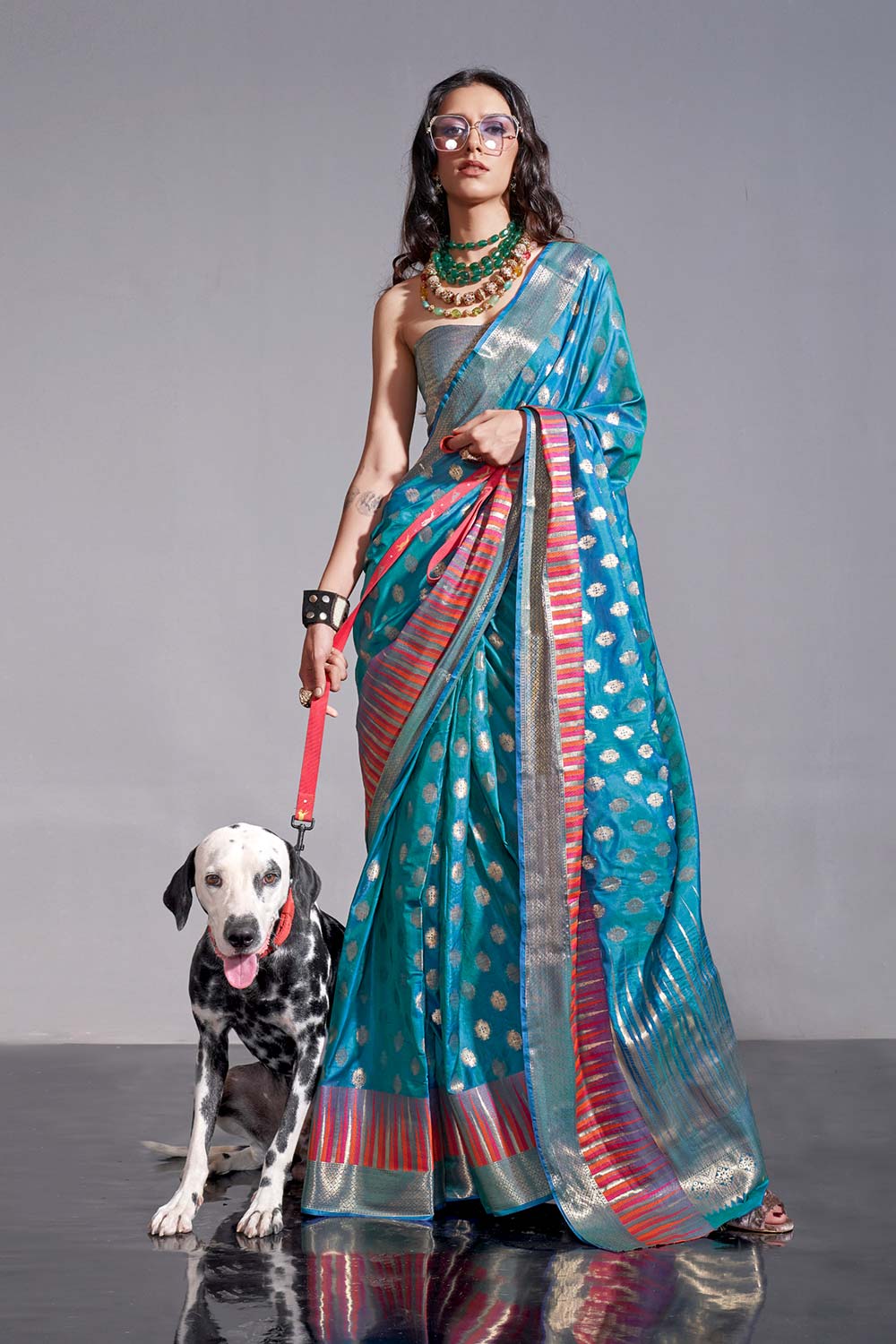 Nadya Teal Kanoi Silk Foil Print Stripe One Minute Saree