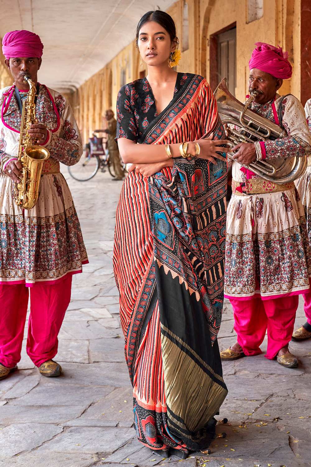 Suri Brown Silk Ajrakh Ready To Wear One Minute Saree