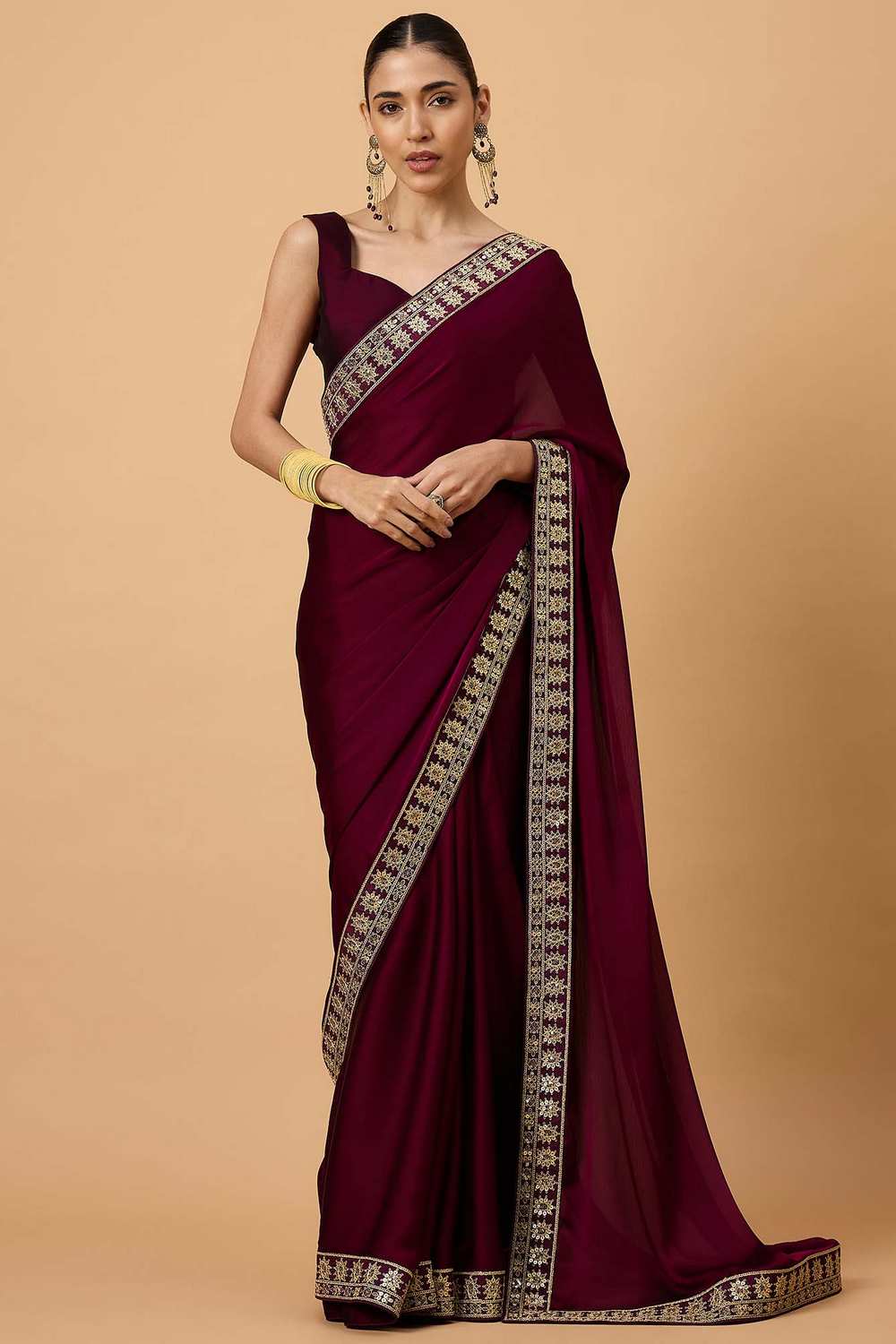 Tyra Maroon Satin Lace Work Border One Minute Saree