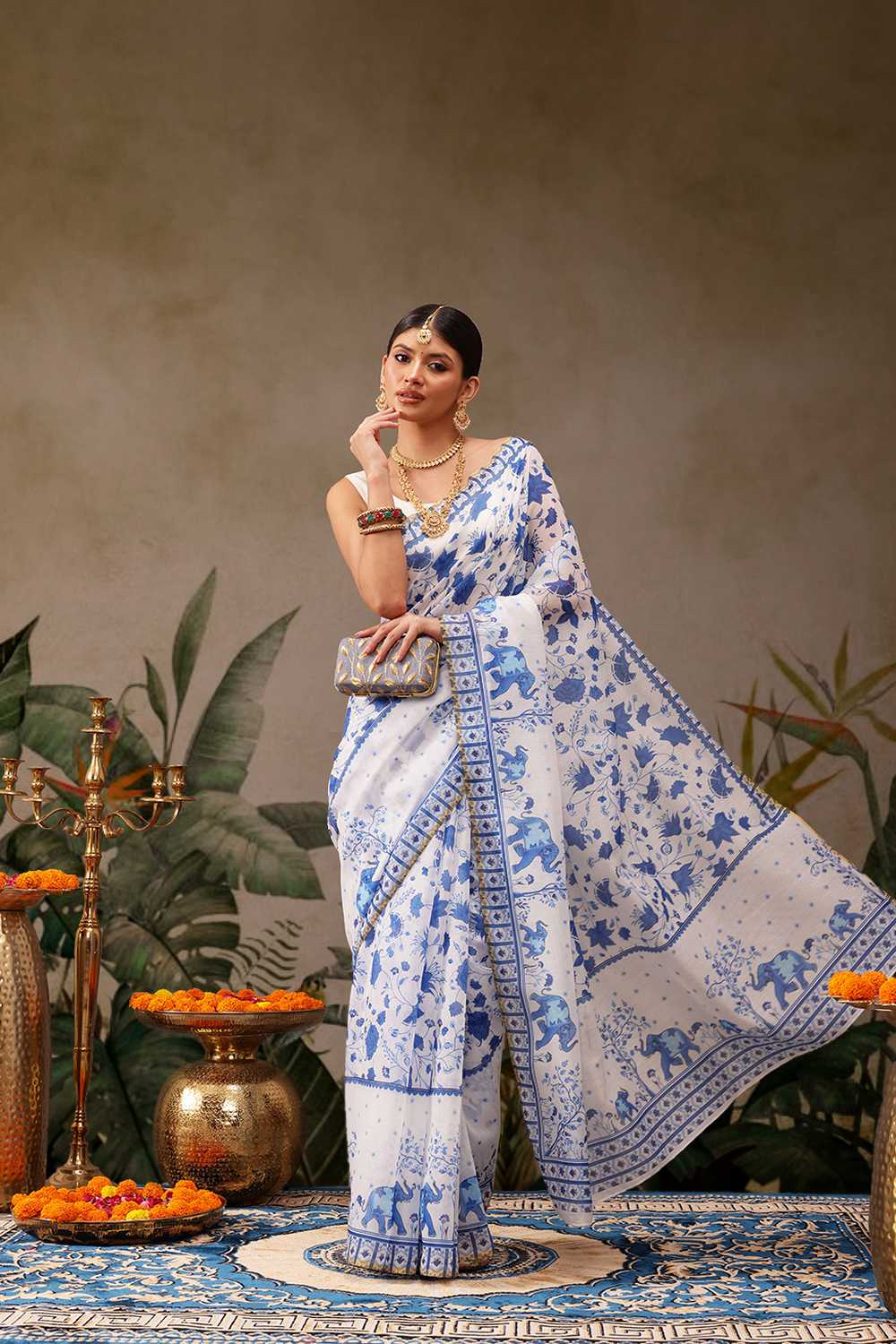 Zora White Cotton Blend Floral Digital Printed Ready to Wear One Minute Saree
