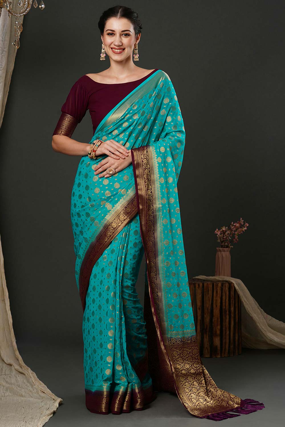 Alekha Turquoise & Maroon Georgette Printed One Minute Saree