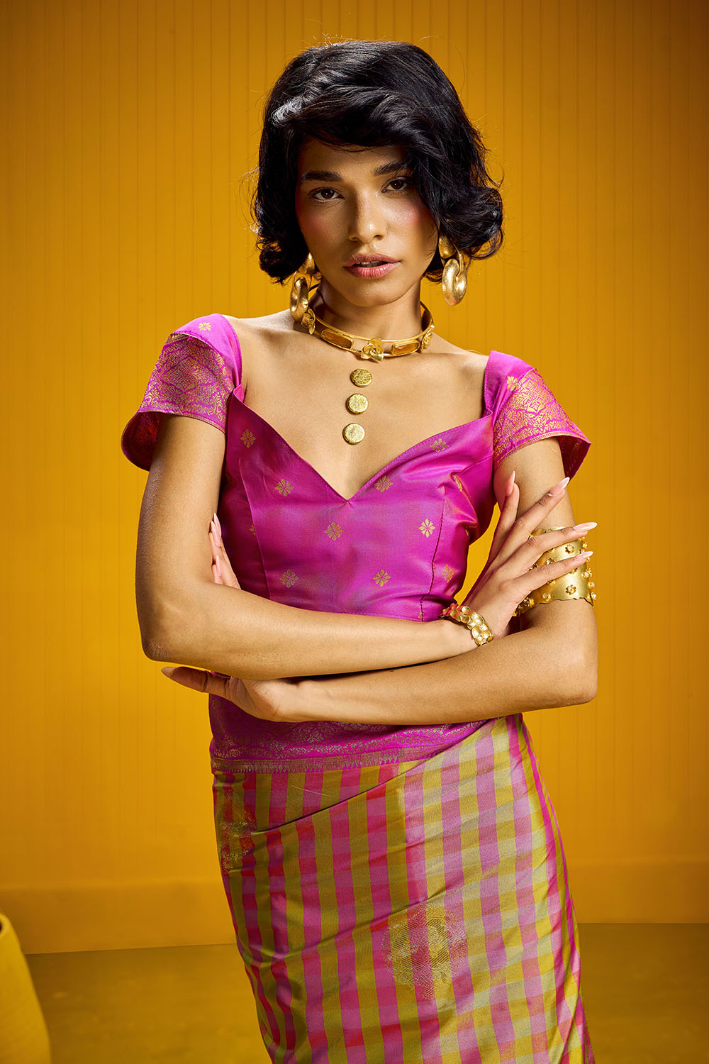 This stunning Rani Pink & Gold Pure Silk Handloom Saree With Zari Checks Weaving from One Minute Saree is crafted from premium fabric, offering a luxurious feel and a graceful drape. The rich texture and subtle sheen make it a perfect choice for festive occasions and elegant gatherings. Designed for ease and comfort, this pre-stitched saree features a built-in petticoat and a flexible fit, ensuring effortless wear and a flattering silhouette. Blending timeless elegance with modern convenience, this saree is a must-have addition to your ethnic wardrobe.