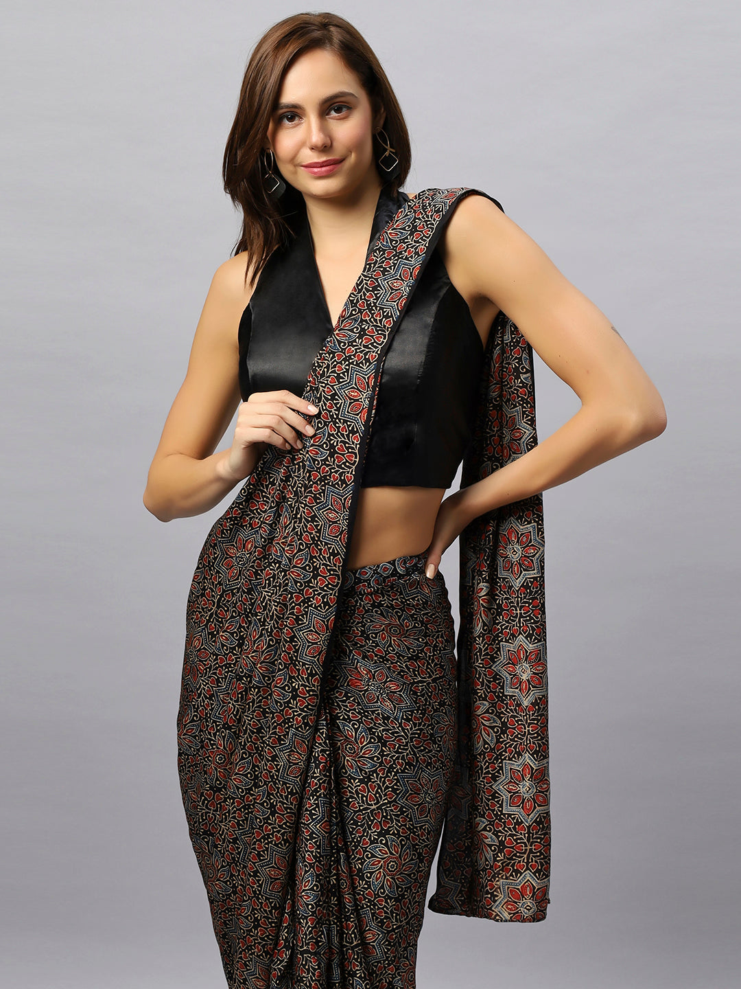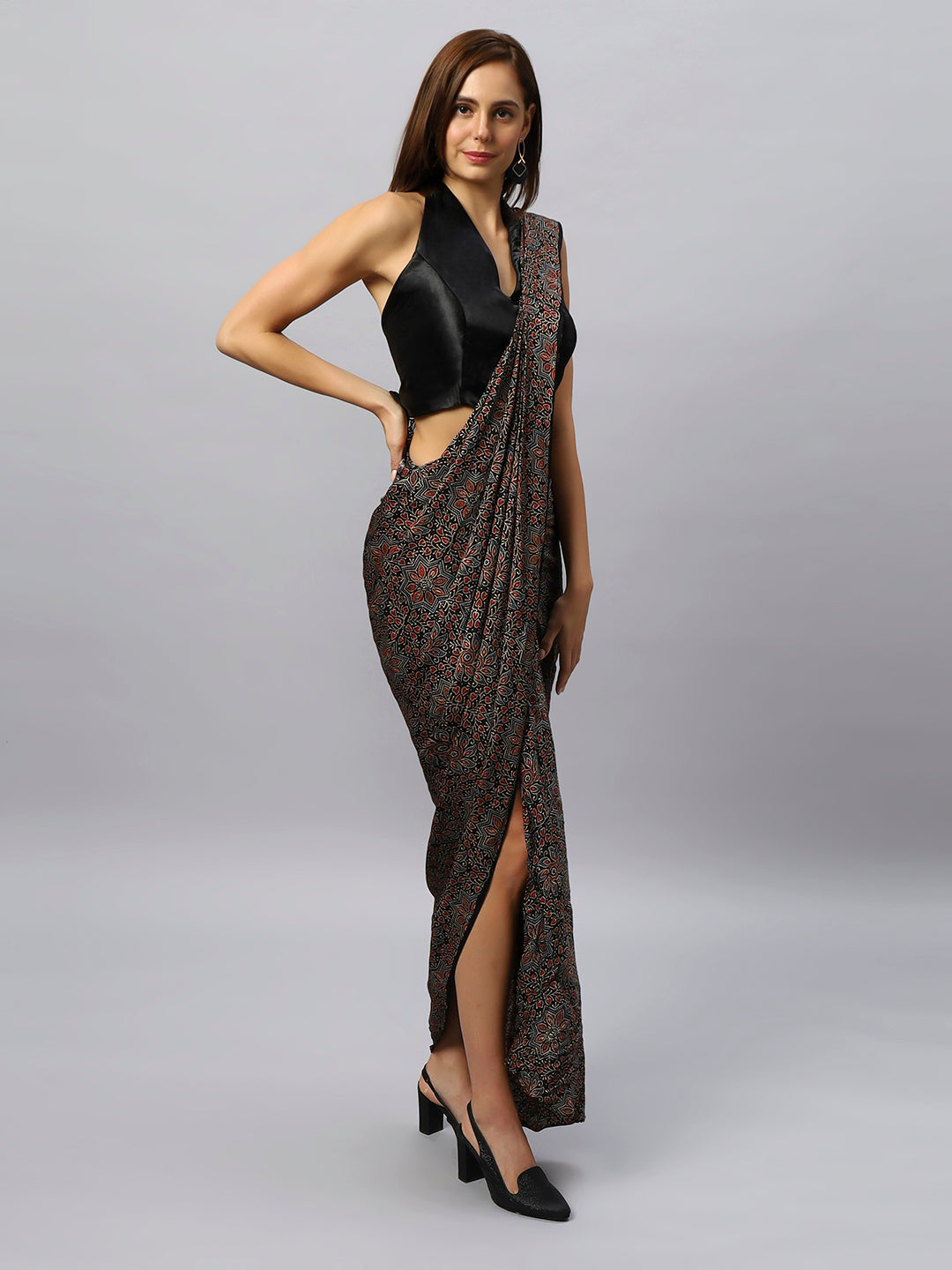 Amara Modal Silk Hand-Printed Ajrakh Sarong Saree (Sku OMS-SS-001-MULTI)
