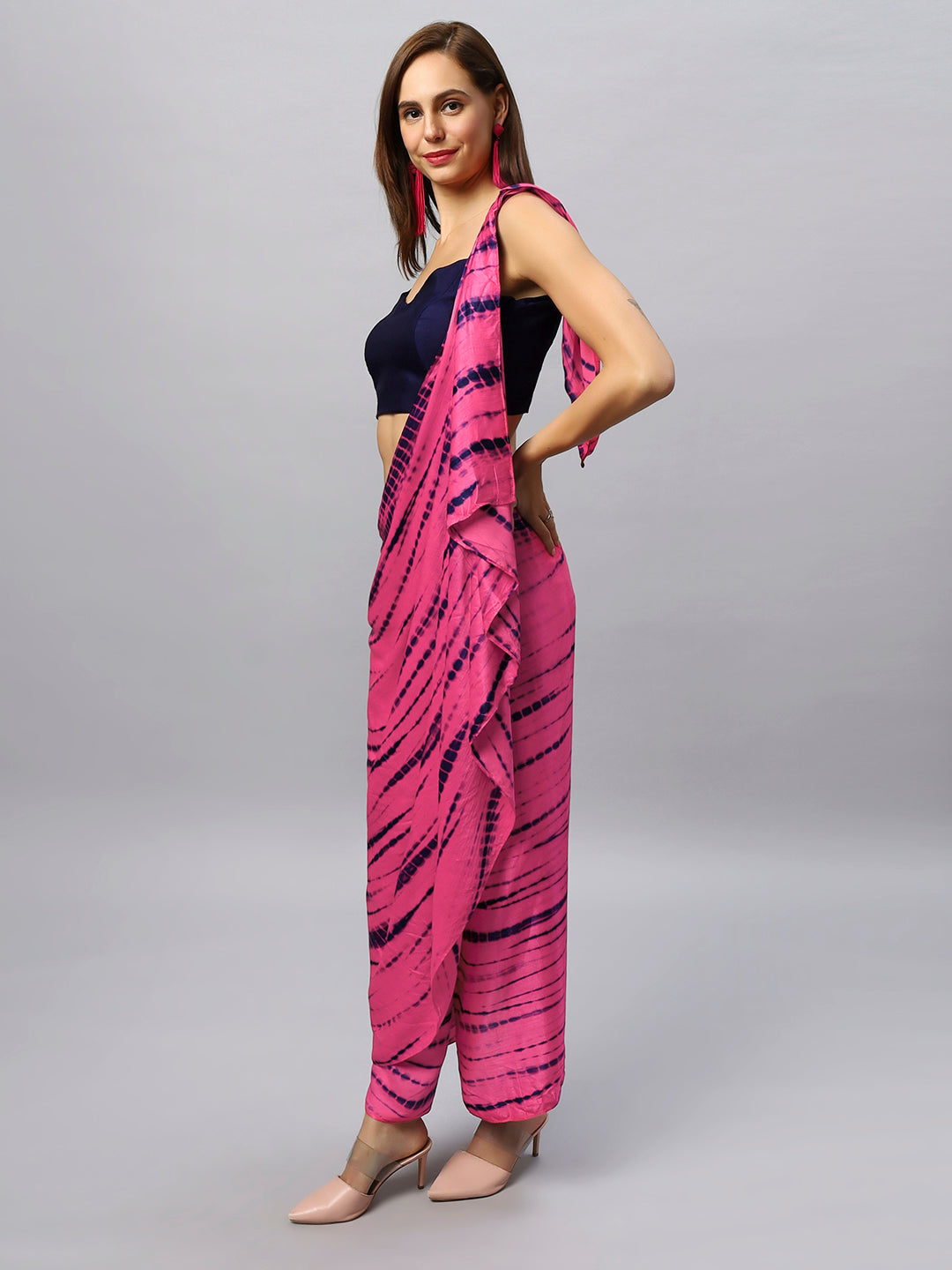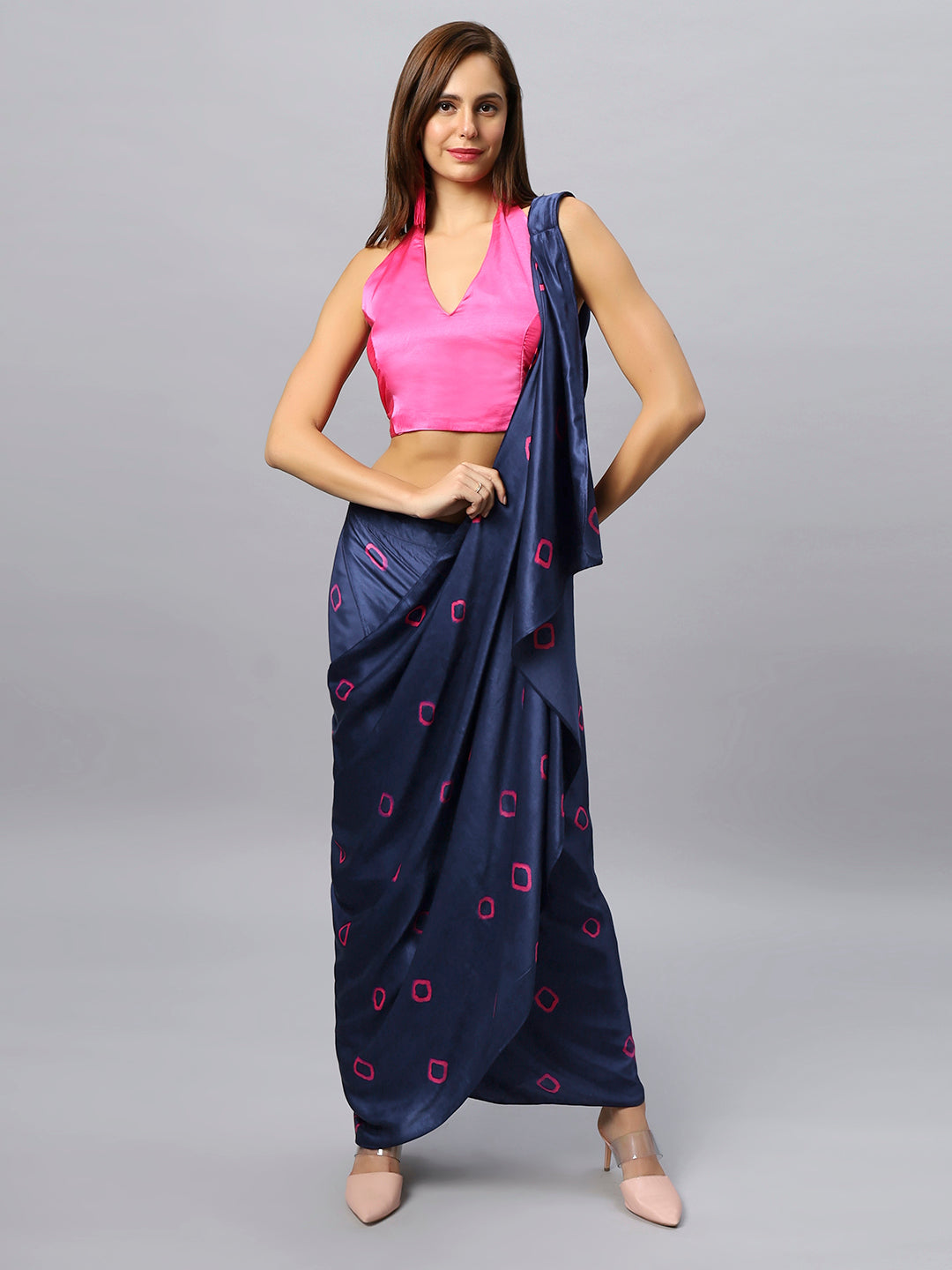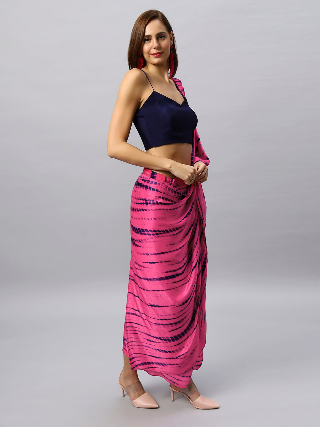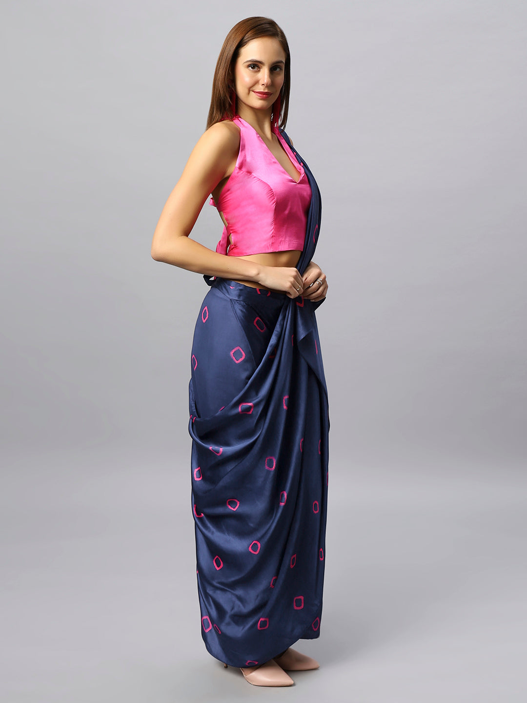 Skye Navy & Pink Shibori Print Modal Satin Sarong Saree (SKU OMS-SS-004-PINK)